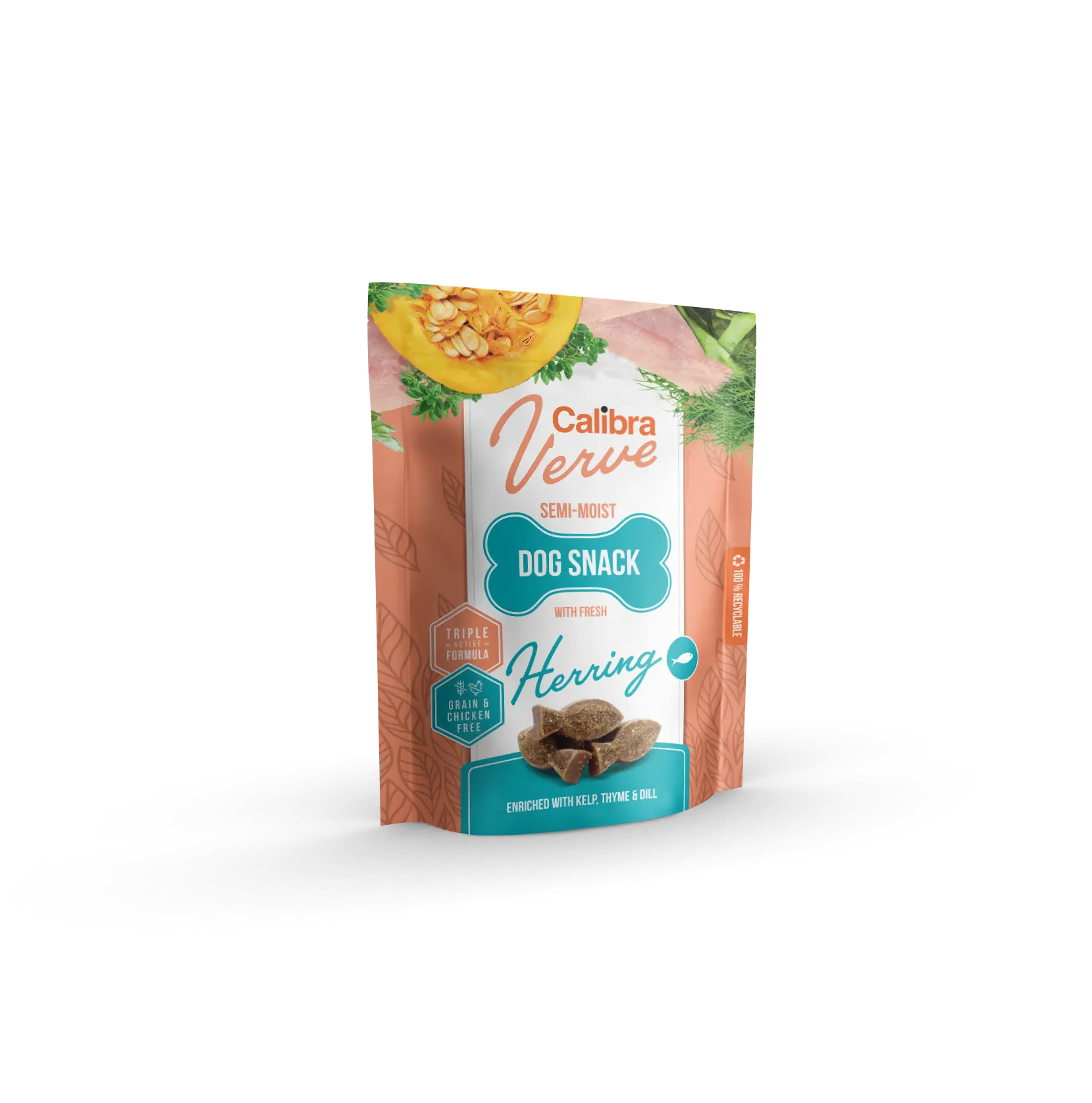 Calibra Dog Verve Snack Semihúmedo Arenque Fresco 150g está formulado con un 30% de arenque fresco, lo que lo convierte en una fuente proteica de alta digestibilidad y gran valor biológico. Esta proteína de origen marino proporciona ácidos grasos esenciales omega-3, beneficiosos para la piel, el pelaje y el sistema inmunológico. La fórmula se complementa con ingredientes naturales como manzana, calabaza y zanahoria, que aportan fibra dietética, antioxidantes y vitaminas.