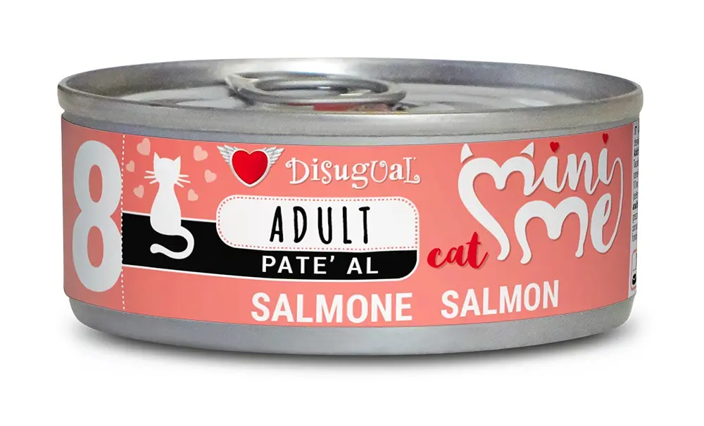 DISUGUAL Mini-Me Cat Salmon es un alimento húmedo premium formulado con salmón fresco para gatos adultos. Esta solución nutricional combina ingredientes naturales de alta calidad con una palatabilidad excepcional, sin aditivos ni conservantes artificiales, ideal para mantener la salud y vitalidad de tu gato.