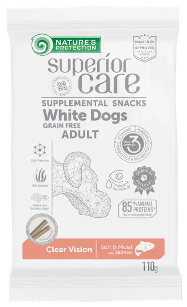 NATURE’S P SC WHITE DOG SNACK VISION GRAIN FREE SALMON 110GR es un alimento complementario diseñado específicamente para perros con pelaje blanco. Gracias a su formulación libre de cereales y su contenido de salmón como ingrediente principal, este snack ofrece una fuente altamente digestible de proteínas y ácidos grasos esenciales.
