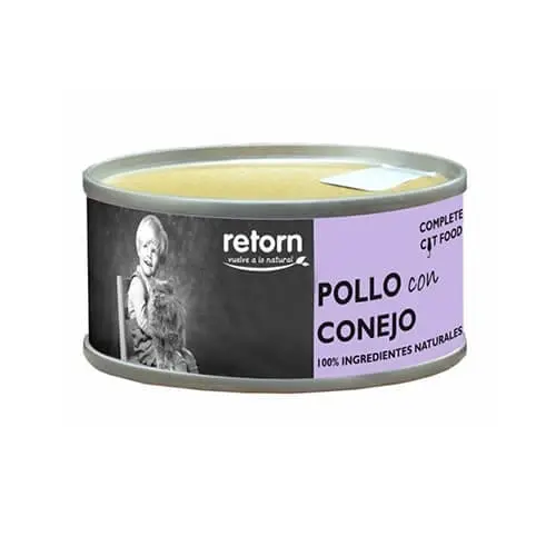 Retorn Feline Pollo Conejo es una comida h��meda premium formulada específicamente para gatos adultos, elaborada con pollo y conejo como principales fuentes de proteína animal de alta calidad. Su fórmula sin cereales, conservantes ni aditivos artificiales la convierte en una opción ideal para gatos con sensibilidades digestivas, mientras que su alto contenido en humedad favorece la hidratación y la salud del tracto urinario felino.